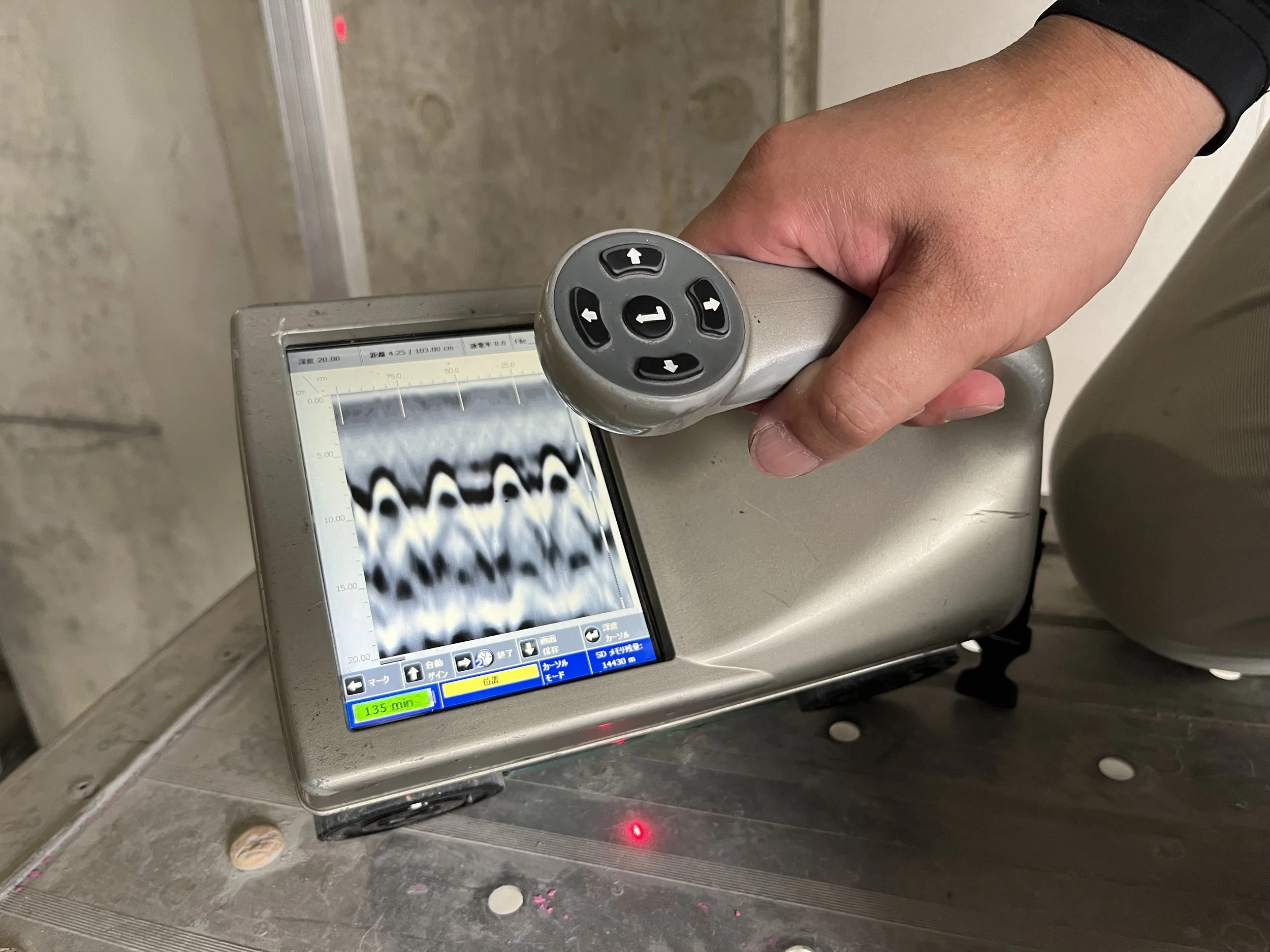 電磁波レーダーでは、コンクリート構造物内の鉄筋・電線管・空洞・ジャンカ・ひび・クラックの位置や深度、かぶり厚及び厚みなどを測定することが可能です。